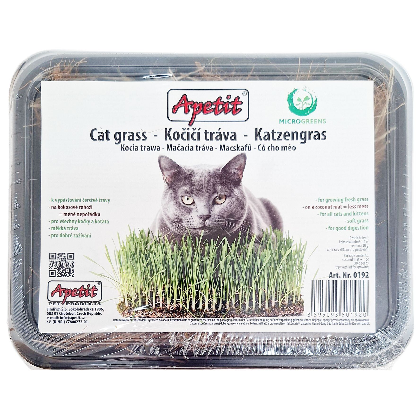 Instructions: Place the tray in a bright and warm place, but not in direct sunlight. Remove the bag of seeds from the packaging, place the coconut mat in the tray and pour 100 ml of drinking water over it. Open the bag of seeds and spread them evenly on the mat. Continue to keep the mat moist, but not too wet. For the first germination phase, leave the tray with the lid closed, then remove the lid and continue to maintain humidity. If the grass has reached a height of 4-6 cm, you can feed it.